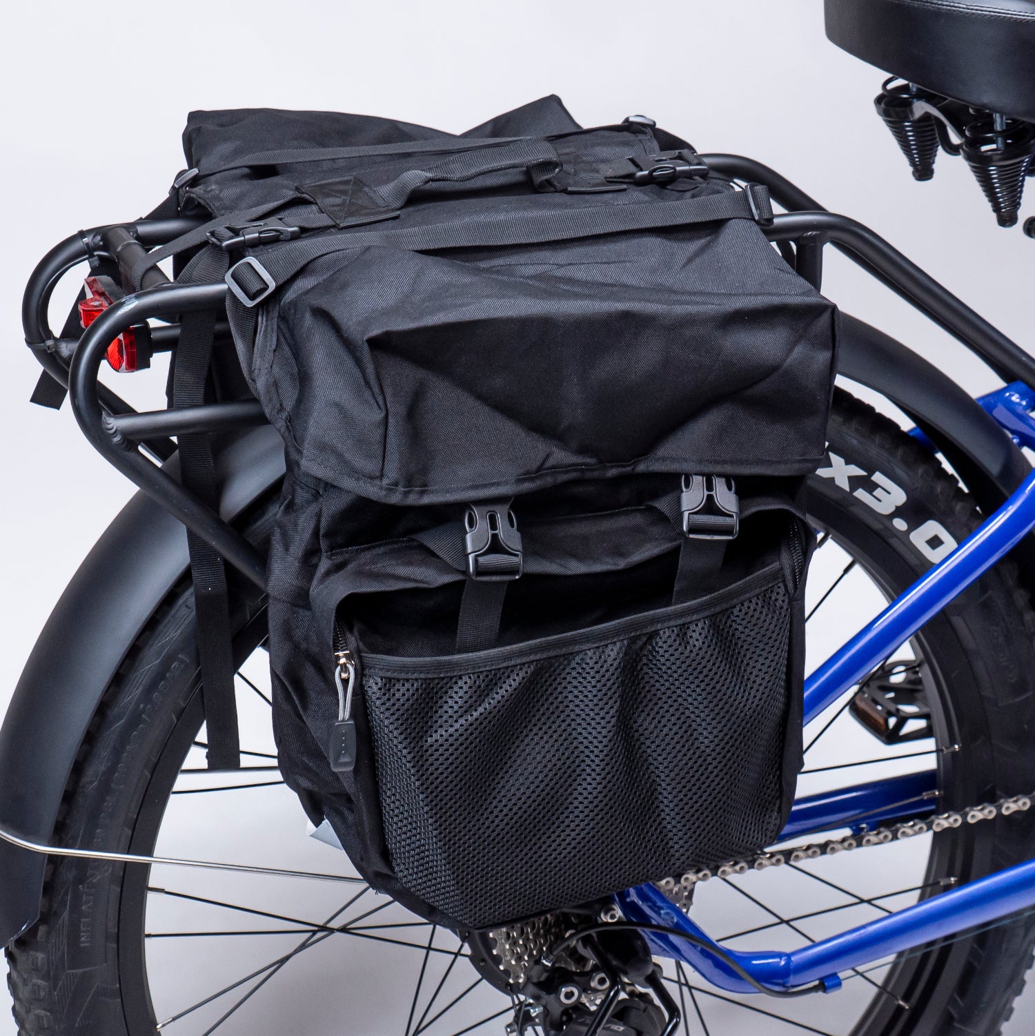 Upgrade your eBike adventures with the Pannier Bags 2.0, designed to maximize your carrying capacity by an impressive 30-40 liters. Pannier 2.0 are deliberately set up for seamless fitment on our thicker bike racks, ensuring a secure and stable attachment. Featuring a quick-release mechanism, these panniers can be effortlessly attached and removed, making them highly versatile as convenient carry-on bags. Whether you're cruising through the city or embarking on a cross-country tour, these bags not only look fantastic but are built with high-quality materials and meticulous tailoring for durability and reliability. The strengthened mounting system ensures a secure fit, while two adjustable belts provide added flexibility for varying loads. With a user-friendly design that allows for easy mounting and release—no tools required—these pannier bags are the perfect companion for all your eBike journeys!