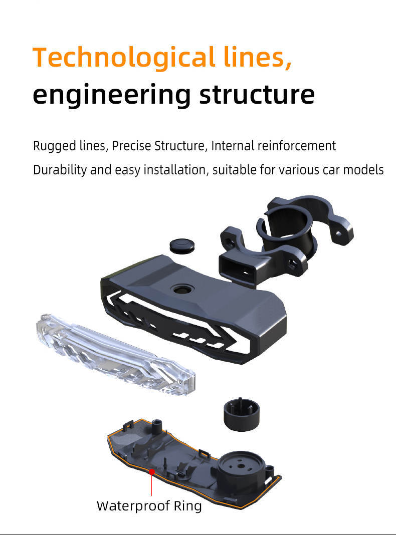 The taillight is made from PC+ anti-UV material, making it waterproof, dustproof, and resistant to high and low temperatures, ensuring its durability in various weather conditions. With power-saving technology, the standby time of the host is up to 4~8 months, and the remote control can last up to 3~5 months on a single charge.